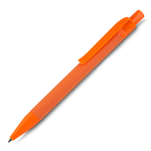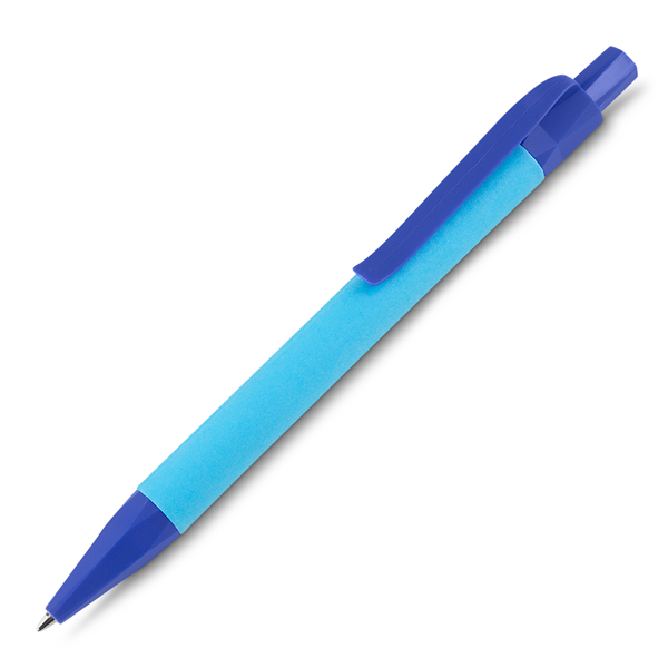 Caneta de papel reciclado com detalhes plásticos, carga esferográfica azul e acionamento por clique. TAM: 13,90 x 1,5 cm PERSONALIZADO
